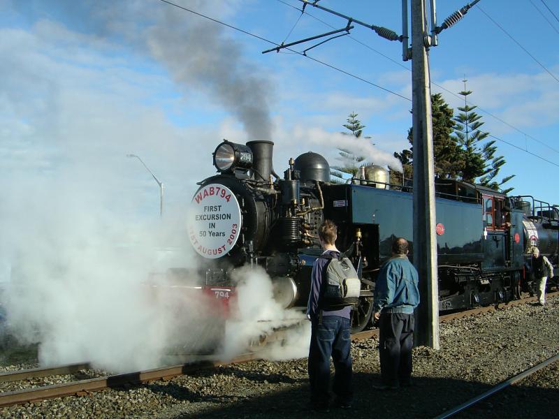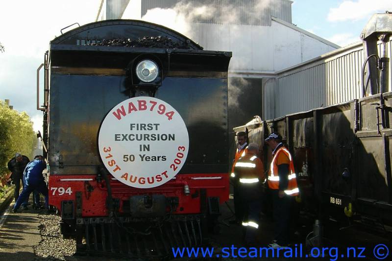 | Wab 794 coupled to Scenic Series Cars in Feilding at 8.50am Sunday 31st August 2003. |