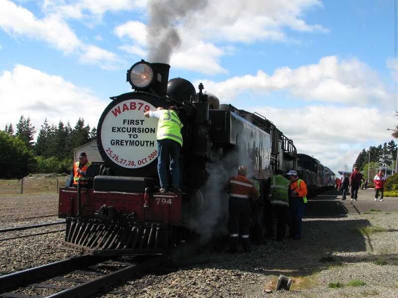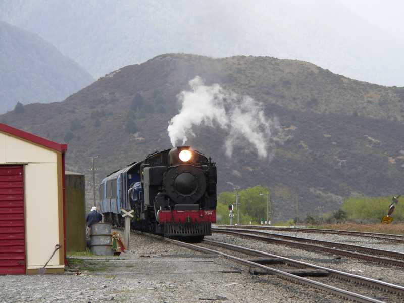 After yet another 0630 breakfast we depart at 0700 by bus for the station. The light-up crew, consisting of Pauline, Keith, Stuart and John were up at 0330. Unattended carriages wait at the Addington station for us to board and Wab794 shortly appears and connects to the train. The President of Weka Pass Railway, Gary Kelly is our driver today and he has not driven Wab794 before.