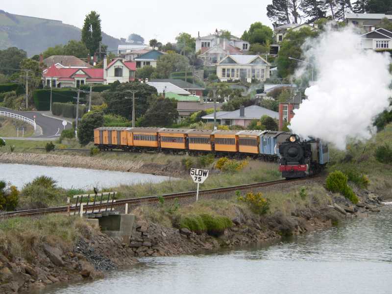 The four hour diesel hauled Taieri Gorge Excursion costs $67 and is one of Dunedin’s leading tourist attractions. It runs on Tranz Rail track from Dunedin to Wingatui and then proceeds along the remaining portion of the Otago Central Branch where it heads northwest across the Taieri Plain. Construction of this line began in June 1879 but was not completed until 1921. During summer on Sundays, the service is steam hauled and extended to Middlemarch - an extra 20 minute run.