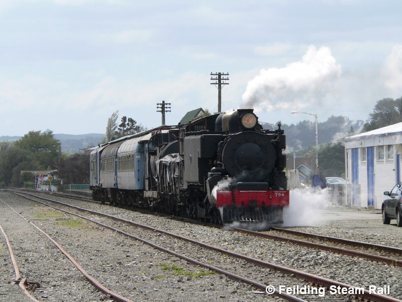 Wab794 deaparting Dannevirke after a short service and waiting to cross with a freight train.