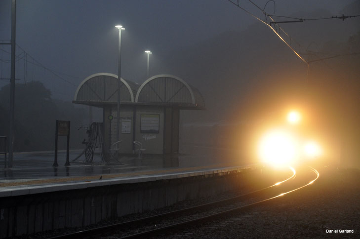 Daniel Garland comments "Having decided to drive up to meet the Wab & F leaving Palmerston North and follow them to Woodville, I encountered Da 1431 and the Tararua Scenic Daylight heading for Wellington at Pukerua Bay in horribly wet weather. The resulting photo is not at all great... I managed to get this shot, then the rain played with the autofocusing and by the time I got it sorted, it had rushed past me already!"