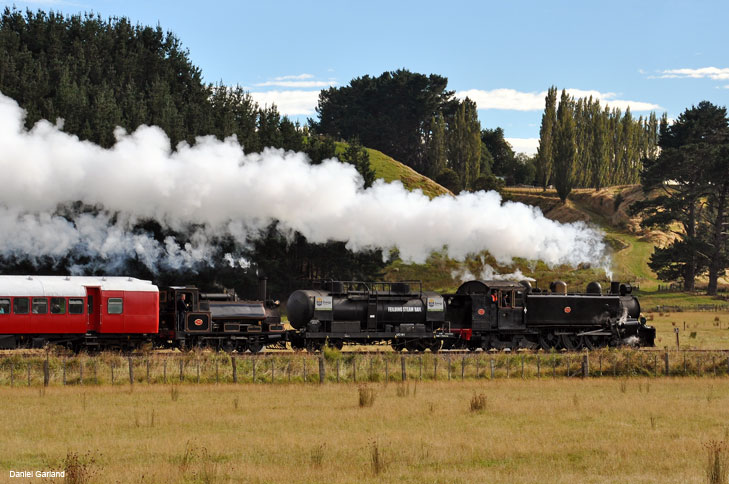 A closer view of the two locos - one of the oldest and smallest NZ tank locos with one of the youngest and biggest. The F was being towed in light steam for the run to and from Woodville.