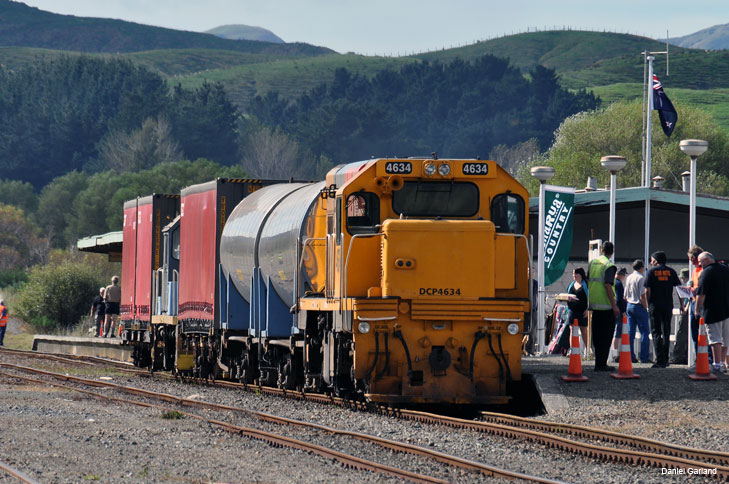 DCP4634 and the Kiwirail rolling stock display at Woodville Station platform.