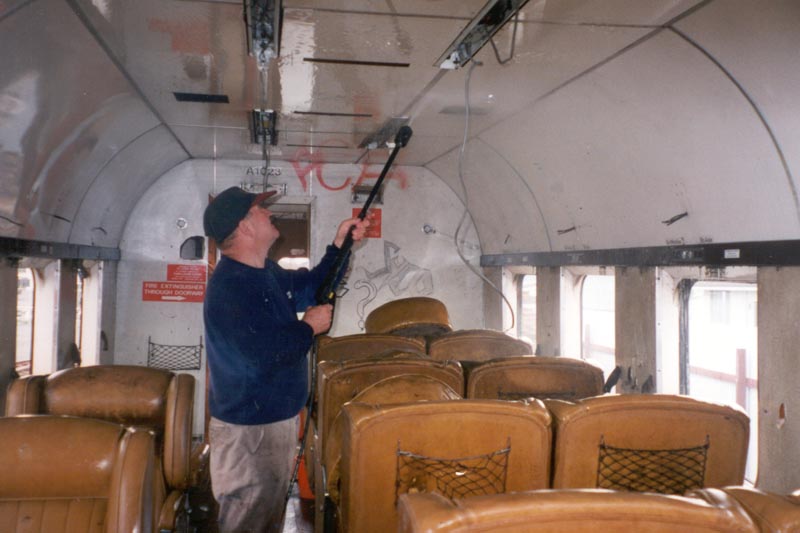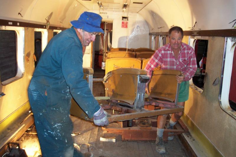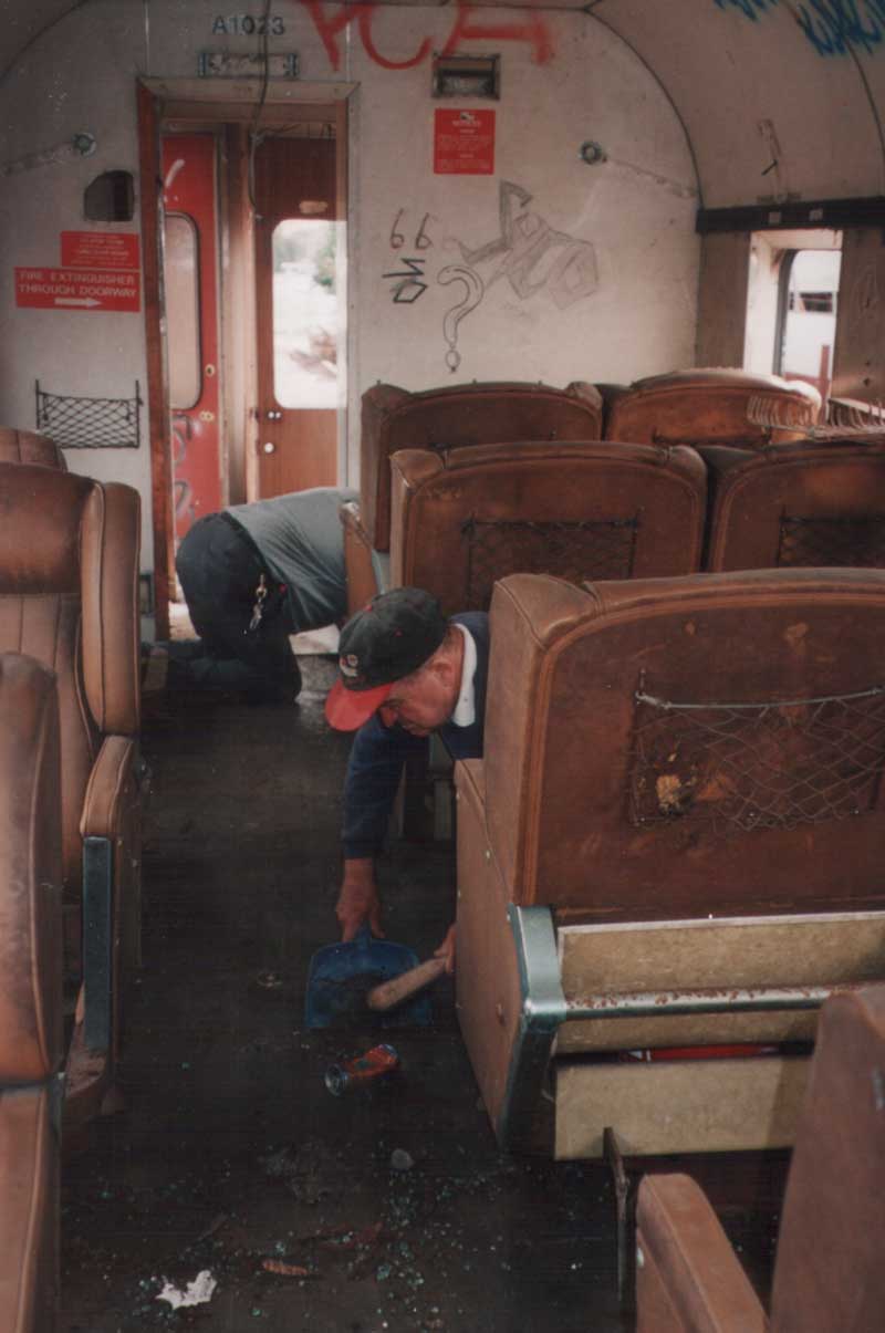 Russell and Rod have started to clean up the first of the two Helensville first class carriages A1023. The plan is clean them out and repair broken and rusted parts and eventually return them to service.