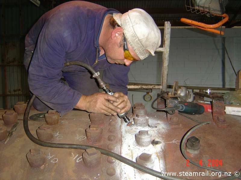 While we were inside the boiler we carefully inspected the extra row of stays for cracks from the inside. We did found a couple, a photo above shows the crack being repaired.