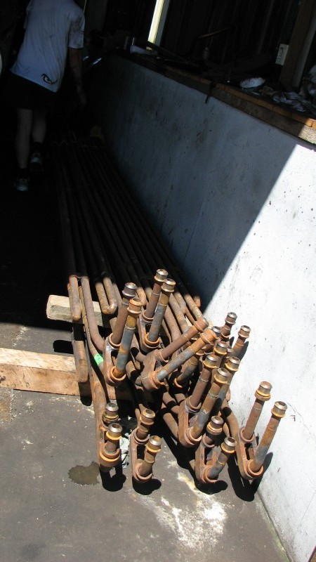 January 2010 Super heater tubes awaiting to be reinstalled. The steam out of the top of the boiler passes though these tubes that are exposed to the heat of the fire. This super heats the steam giving it more energy and more efficent running. |