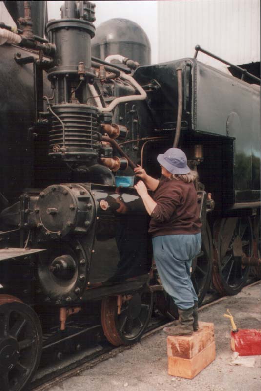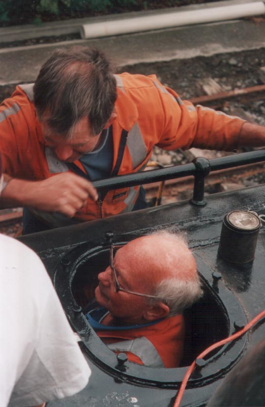 28th July 2001 We have now hydraulically tested all of the superheater elements to over 1000 PSI and found a couple of leaks that have been repaired and retested. All the elements are now fitted to the locomotive. We have also pressurised the Westinghouse braking system to check that all the brakes and valves function correctly. We love your pixie hat Mike! |