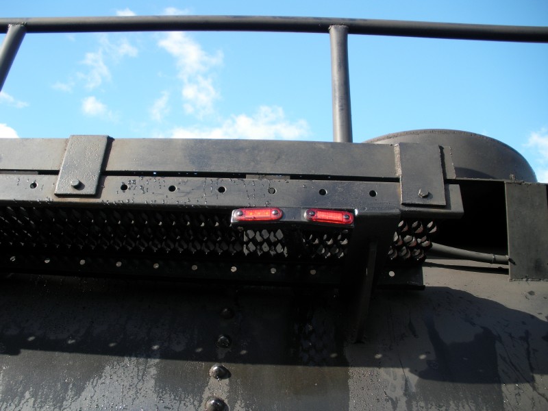 Inside the tank is a level detector that we made. It is made of a piece of electrical capping with wires coming out and equal distances apart, with the final wire on the bottom of the tank as the common wire. Electricity passes though the water and the controller is then able to work out how much water is in the tank. This level indication is sent via a cable to a set of LEDs (lights) setup in a line so the fireman can see how much water is in the tank behind him without leaving the cab. Also you can see the baffling that we added to prevent the rolling effect that the tank had when running partly full. The baffles are simply roofing iron.