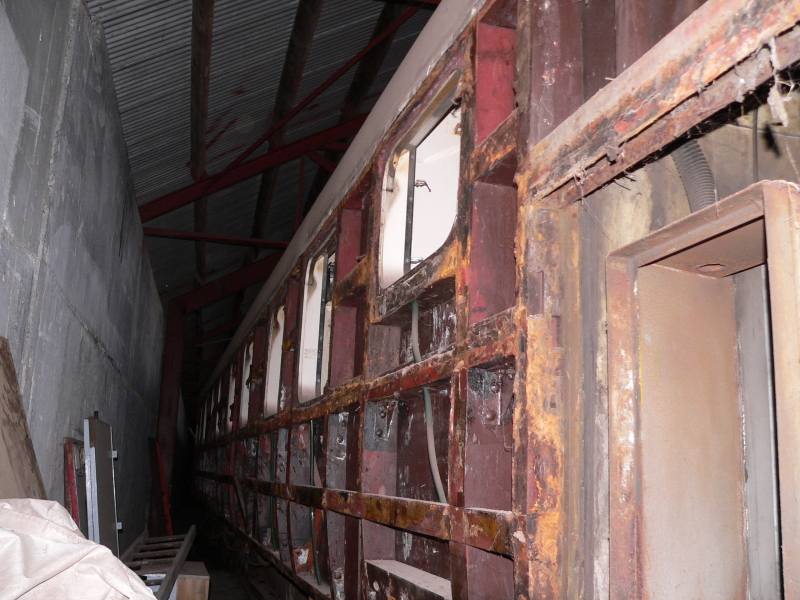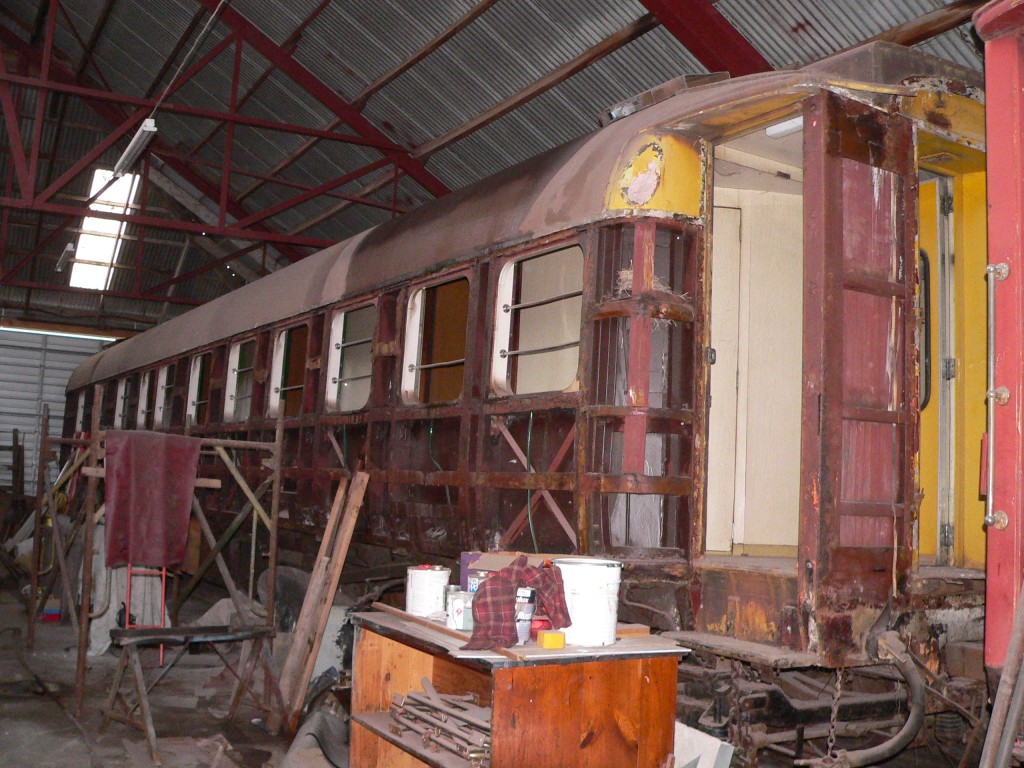 This carriage was purchased by Reid McNaught and stored in the open at Steam Inc depot at Paekakariki. The outer steel sheeting had corroded badly in the salty air, to the point the windows could fall out. Internally the carriage is in good condition and only a small amount of fittings are missing. It was supplied without the high speed bogies, but will be converted back to the standard X25530 bogies when overhaul takes place.