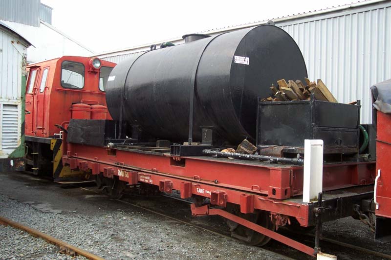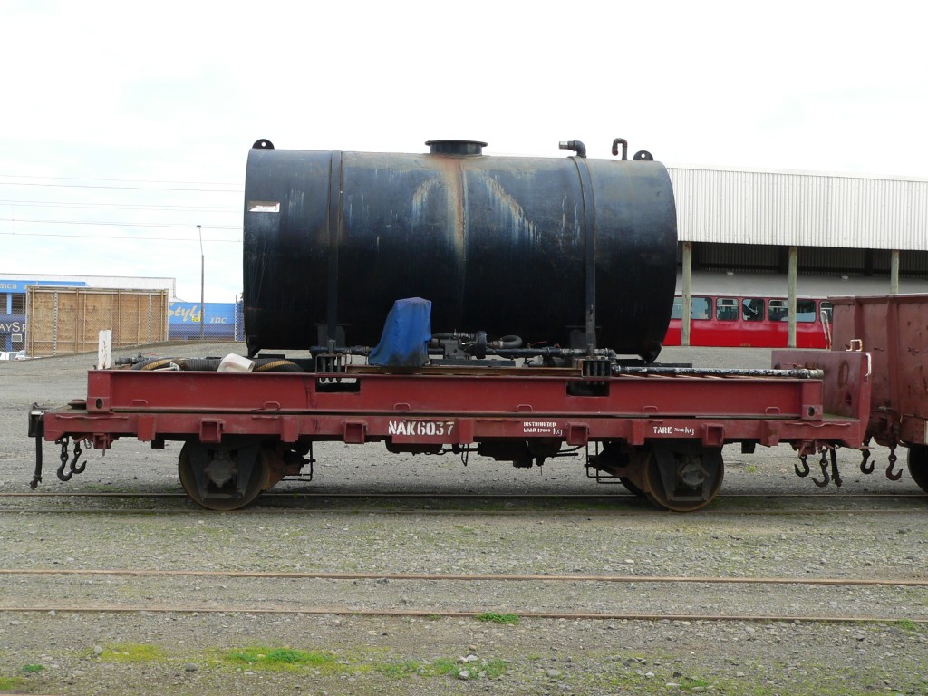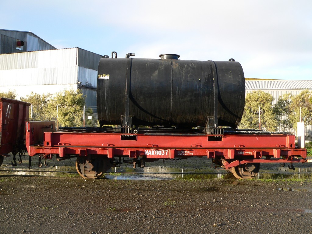NAK wagons are flat deck wagons fitted with tie down chains and twist locks. This enabled these wagons to carry a 20 foot container or deck cargo. NAK 6037 has a container based tied on to it and the container base has a large water tank fitted to it. This Nak is used with F 163 on its trips to provide additional water storage. This NAK was used on the mainline by the F group. Fitted with roller bearings.