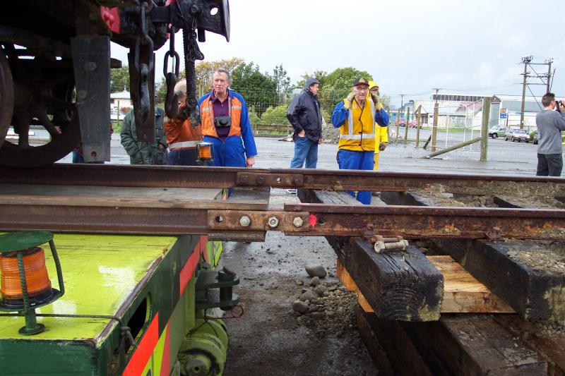 Transfield staff with the help of the loader at Lyttelton Port Company connect the track to the Transcarr trailer ready for the transfer of X442, Photo by Colin Dash